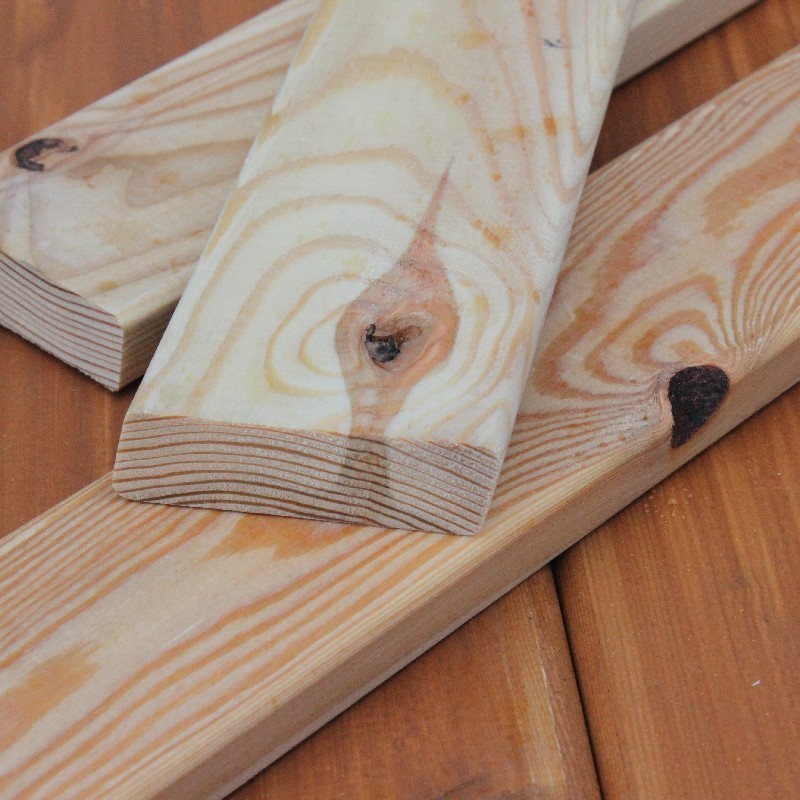 Die Rhombusleisten in Restposten aus sibirischer Lärche sind kammergetrocknet mit 14%(± 2%) Restfeuchte und allseitig glatt gehobelt.