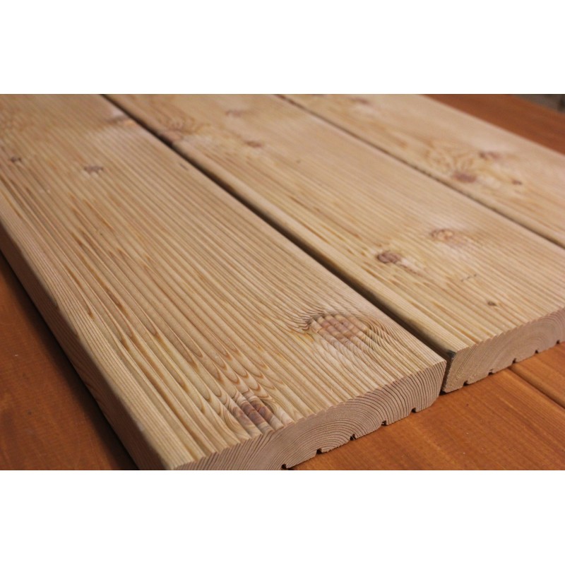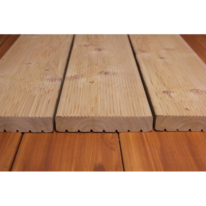 Die Terrassendielen in Restposten mit Kombiprofil (fein geriffelt / genutet) aus sibirischer Lärche sind kammergetrocknet mit 12%(± 2%) Restfeuchte, allseitig glatt gehobelt und Kanten gefast (abgerundet).